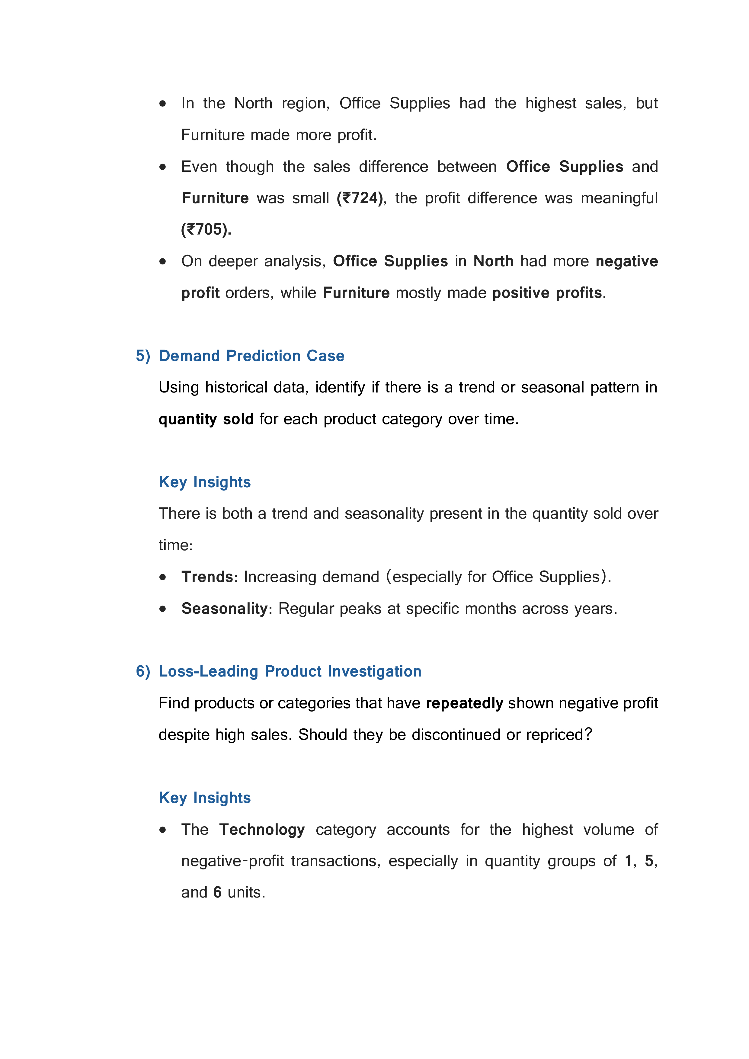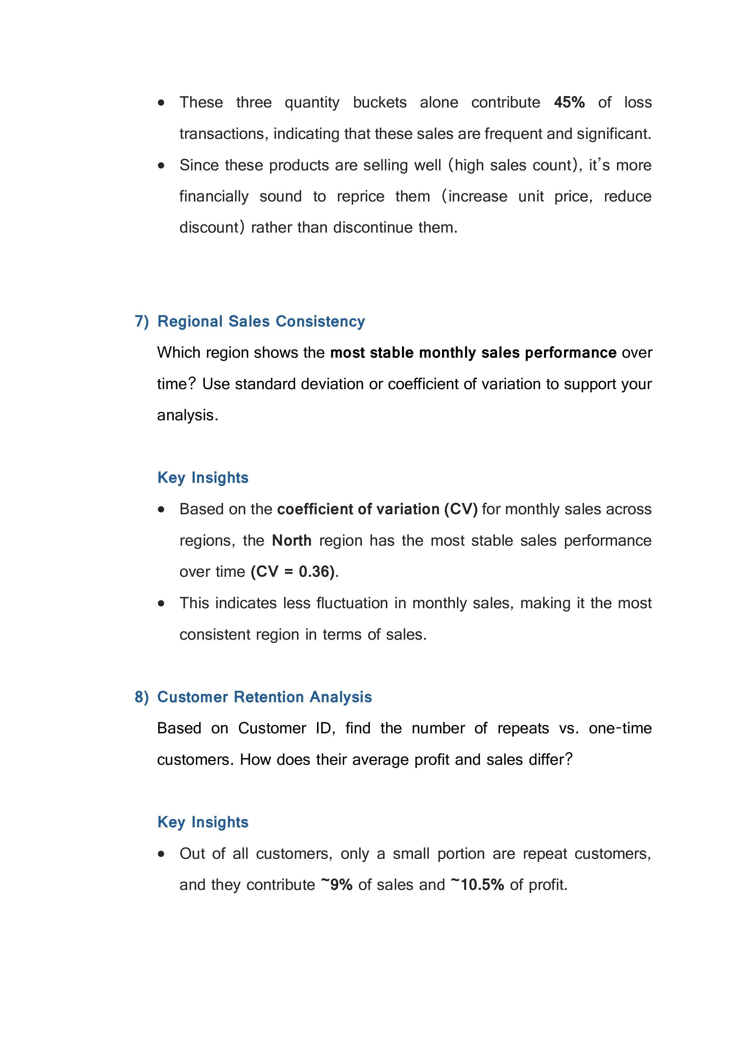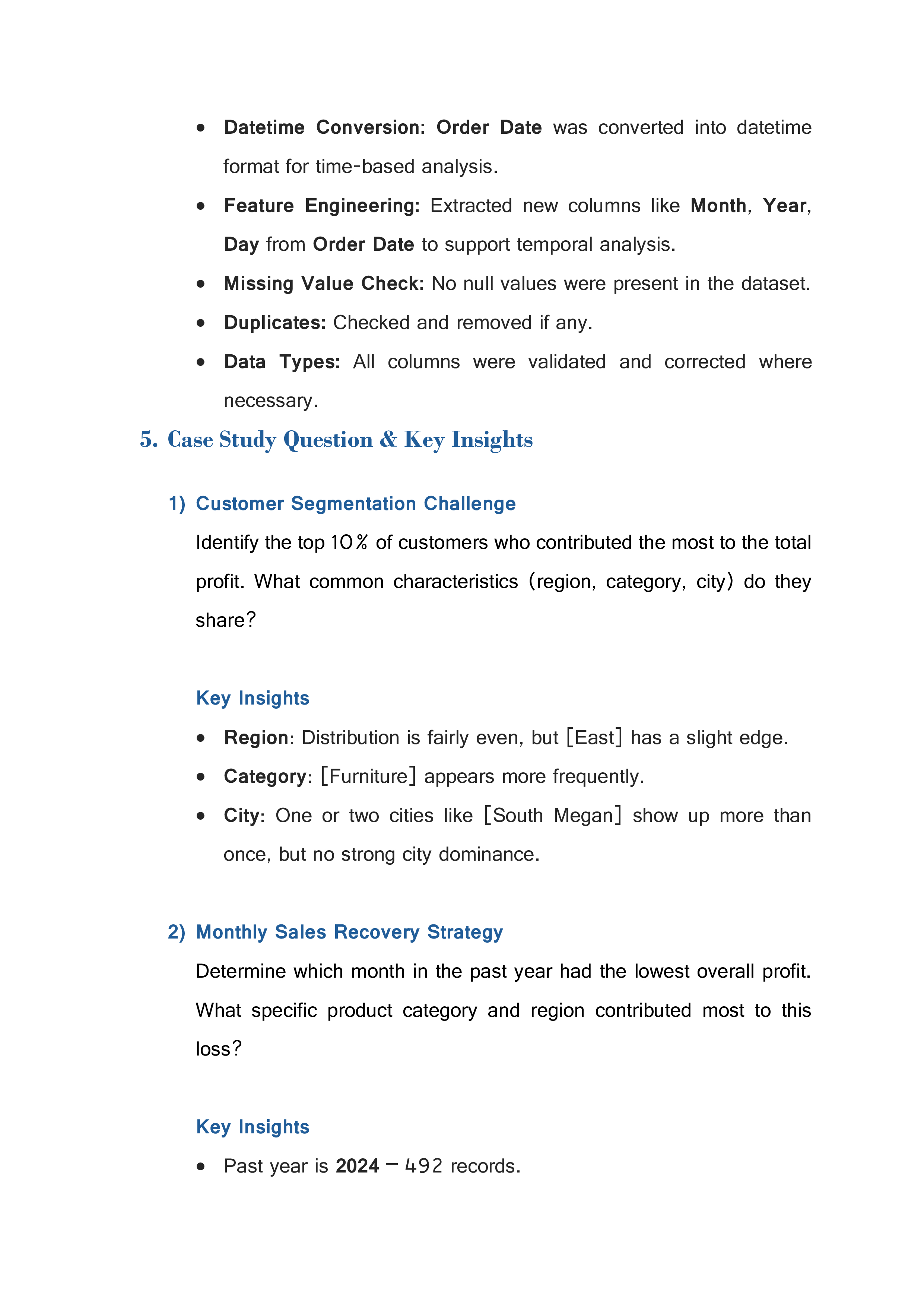 Region: Distribution is fairly even, but [East] has a slight edge.Category: [Furniture] appears more frequently.City: One or two cities like [South Megan] show up more than once, but no strong city dominance.df_loss = pd.DataFrame(df)